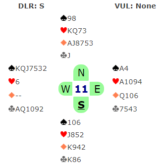 Den doblede kontrakten ble ikke særlig festlig. Det kom ruter ut til esset og kløveravkast fra vest. Spillefører førsøkte en trumf fra bordet, Tundal la damen, og esset vant stikket. Så spar fra topp, men Tundal kunne stjele den tredje, ta for trumfkongen og presse vests trumf med ruter. Spillefører fikk kun for trumfene sine, Tundal tok resten, +1100!