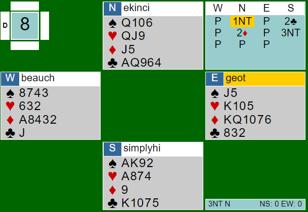 I et spill ganske tidlig ble vi holdt ute av meldingene fordi de åpnet med en svak 1 NT. Det er ikke alltid gull, men skulle vise seg å være helt greit denne gangen. Spillet så slik det ut: