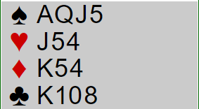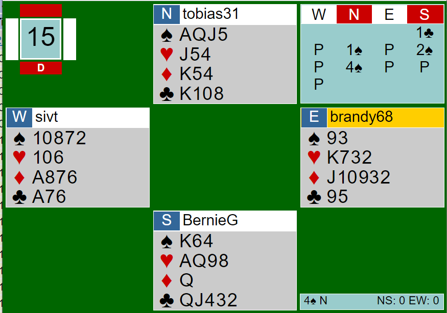 Mot lag FASTING hadde spillefører ingen problemer i 4 spar etter ruter knekt ut til esset fulgt av nok en ruter. Han la liten fra nord og trumfet hos sydn, så fire runder trumf. Deretter, uten flere trumf på noen av hendene ble kløverfargen godspilt, og ruter konge var fortsatt stopper i den fargen.