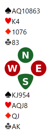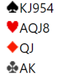 Ukens tema kan være satse eller ikke satse. Først kan du studere Nord sin hånd her, du er i gunstig sone og Øst som er giver starter med 1 ruter (4+ og 11- ca 20 hp). Makker i Syd går innpå med 1 spar og Vest drar uten særlig betenkning opp 3 NT. Hva tenker du om dette og hva gjør du selv?