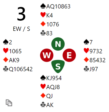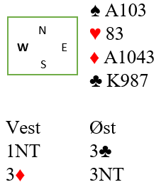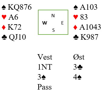 Mot oss hadde riktig nok Øst gått innpå med 2 ruter, men da jeg frivillig meldte 3 NT vet jo Tone Annette at jeg har 4- kort spar og rettet til 4 spar. Men da ruter kom ut med taper til A og K både der og i kløver var det fort en bet og -100. Det ga 16-26 tapt spill. Men ca 1/3 hadde som Syd passet 3 NT og rører motparten minorfarge er det der alltid minst 9 stikk. Vunnet 3 NT med 9 stikk ga 34-8 i score, en stor forskjell selv om 4 spar oftest er beste kontrakt. Var Syd inspirert eller var det «bare flaks» å passe ned 3 NT?