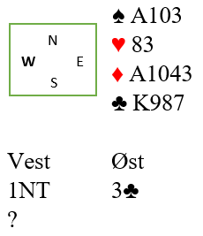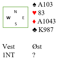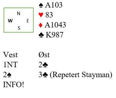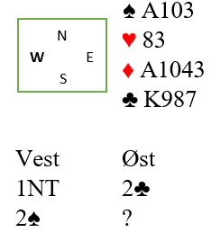 Makker spør etter majorfarge ved hjelp av Stayman og får svar 2 hjerter. Da hopper svarhånden til 3 NT som lover minst 10 hp. Hva ville du da svare med Syd sine kort?