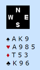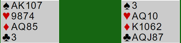 I budserier passer man vanligvis på å finne ut om det er 4-4 eller 5-3 eller bedre tilpasning i major, for normalt er det da minst ett stikk der enn i grand, og i farge tåler man også svak sidefarge der stjeling sikrer mot mange tapere. Men «fasit» er ikke garantert, det skal spilles først. Her er Syd giver i ugunstig sone. og åpner med 1 NT, det viser jevn 15-17. Se bare på den hånden foreløpig.