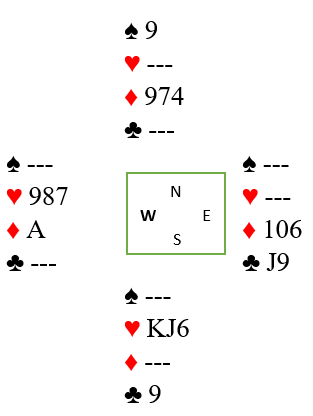 Ø vet nå at makker er kort i hjerter, men melderom er jo tatt bort og det blir gjetting om tilpasning.. Men full av optimisme meldte Norstad 4 spar. Så fulgte to ganger pass. Med få motspillstikk, men har bare makker her litt tilpasning i kløver vil stamp på 5- trinnet være lønnsomt tenkte jeg. Dermed 5 hjerter. Dobling fra Øst advarer jo og etter litt vurdering før pass fra Vest avsluttet. Hjerter ut og da så jeg jo at her var gedigen feilbedømming på gang! Litt hjalp det da Vest var renons i hjerter, men likevel var det lett å se at 4 spar neppe kunne vinnes. Og det stemte da det etterpå viste at frivillig bud i ny farge på 4- trinnet var med en nokså ordinær 4- korts farge men OK styrke og sekundærstøtte i ruter. Jeg trodde Norstad hadde minst 6+ i fargen og gikk på limpinnen! 3 bet var umulig å unngå, men det ga jo 2—38 i score. Pinlig!