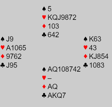Det er visse muligheter i 6 hjerter om en ser kun N/S sine kort, fordi nord sin hjerter er såpass sterk. Med ruter ut mot 6 hjerter må nok ruterfinessen gå, og så må hjerteren gi kun en taper. Slik det sitter er det to hjertertapere.