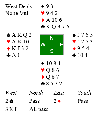 Så uten andre avtaler går det 2 kløver-2 ruter, 3NT og ofte blir det kontrakten. Det kan jo gå bra, men det er ikke umulig vi skulle spilt en annen kontrakt, i dette tilfellet typisk 4 spar hvis makker har firekorts farge der. Og om han har det kan han ikke godt/trygt melde noe over 3NT med svake kort, for hva om han ikke treffer deg med spar? Da kan vi fort komme for høyt.
