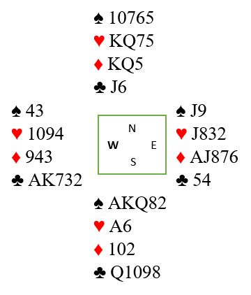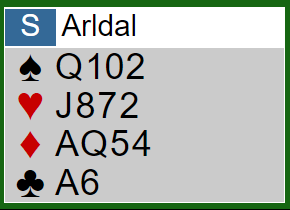 . Atle fortsatte med hj K og liten trumf til bordet. På kl 4 la Nord lavt og Atle det samme så jeg fikk på 9-eren. Ruter gikk så til stjeling og da liten kløver ikke felte noe fra Syd kunne ikke kontrakten lenger vinnes.
