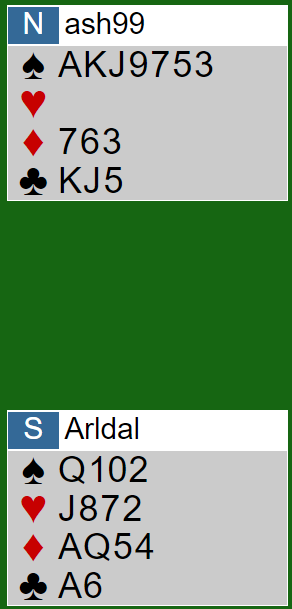 Arild spilte slik etter 1. stikk og kl K i 2. Han stjal en ruter, tok sp A og sp K (sak av kl + ru selv) og kl A før en spar ble stjålet. Så ny ruter til røff der Øst måtte på med kongen. Dett var dett, trumf fra bordet stakk Øst med esset, men spar opp kunne stjeles med hj 10 og trumf K og J trakk ut resten av trumfen som var ute og hånden sto så. 11 stikk og 31- 13 i score etter bra håndverk av Simensen!
