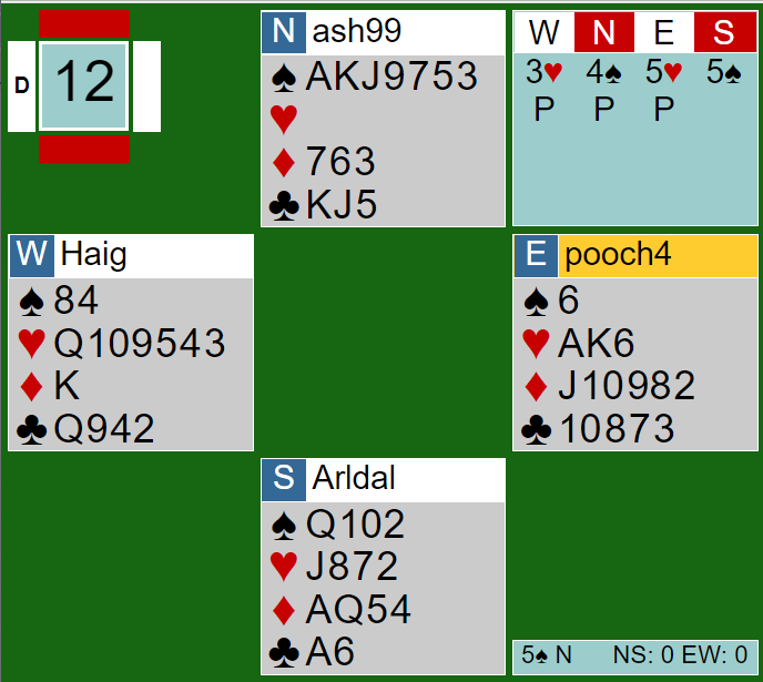 Arne åpnet med 3 ruter i ugunstig sone, Atle gikk innpå med 3 hjerter, jeg svarte 4 ruter og Arild dro til med 4 NT og fikk greie på at makker hadde to av de 5 essene (hj K= ess) uten hj D. Så ble kontrakten satt til 6 hjerter. Ru K ut og Arne stakk over med esset som Evensen kunne stjele. Atle skulle spille hjem 12 stikk. Hva ville du spilt på?