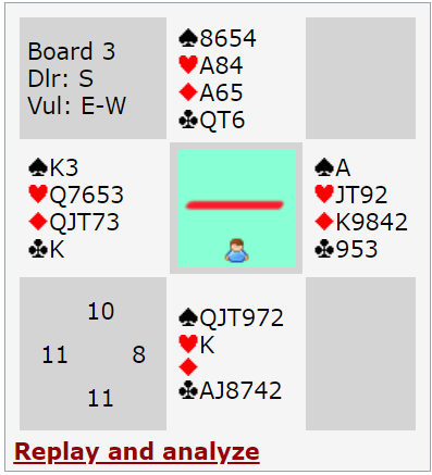 Minimum er altså innenfor det intervallet han vist så langt, så dette viser en helt minimums åpning, 12-13, kanskje 11 poeng av og til. Hvis 2NT meldingen er avtalt som «minst invitt» kan makkerparet stoppe i 3 spar nå.