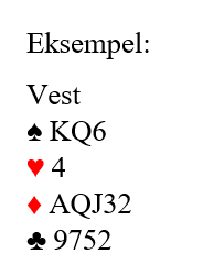 I denne artikkelen har vi sett på det med åpners støtte med kun tre-korts etter starten 1 i minor – 1 i major. Det kan også være en del hender hvor det ser best ut å støtte, og trolig er best å støtte til 2 spar med kun tre spar etter starten 1 hjerter – 1 spar. Samme opplegg kan i så fall benyttes i de videre meldingene om svarmelderen går videre.