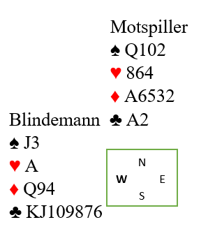 Vest har ikke noe inntak til kløverfargen lenger, så om spillefører forsøker å godspille fargen kan nord bare ligge unna en gang. Med liten spar fra nord slippes den til knekten og spillefører har 6+2+0+1= 10 sikre stikk, og han kan med det motspillet få elleve (stjele en hjerter). Det effektive motspillet er spektakulært, nord må i tredje stikk spille spar dame!