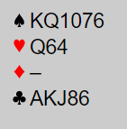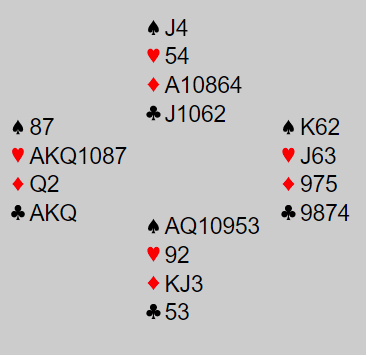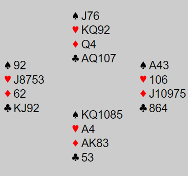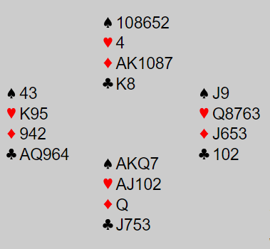 Det kom ruter ut til stjeling. Det er ikke mange tapere, men manglet stikk her, så spillefører sendte i vei spar konge og kastet en ruter fra øst. Syd vant med esset og spilte mer ruter til stjeling. Det var et godt stykke igjen før slemmen var spilt hjem, men to spar ble stjålet underveis, kløvervalget ble tippet korrekt (toppe ut damen), og da var det bra sjanser til slutt. Sparen kunne gå, eller det var en sjanse for fire hjerterstikk.