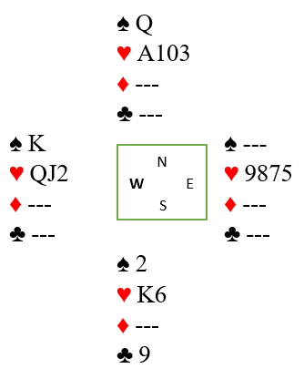På kløver 9 kan vest pakke sammen. Du bare sitter og følger med på om han kaster spar konge. Gjør han det kaster du en hjerter fra nord og tar de tre siste med hjerter konge, hjerter ess og spar dame. Hvis ikke vest kaster spar konge kvitter du deg med spar dame fra nord, det kortet har gjort nytten sin. Så prøver du hjerteren. Enten står hjerter 10 til slutt (som her), og hvis ikke skvisen virket (øst hadde for eksempel hjerter knekt fjerde fra start) får øst det siste stikket i hjerter.