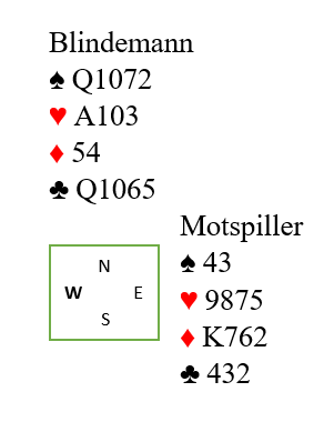 Vest spiller altså ut ruter knekt mot 3NT. Mange tenker at det er nok fra noe sånt som J109-fjerde, eller femte, og legger liten som styrkekast. Og det er greit hver gang syd har A-Q, men det blir fryktelig feil om syd har bare damen som det var i dette spillet. Da får han ett stikk i den fargen som han ikke burde fått, og det er det niende stikket på et sølvfat helt uten kamp!