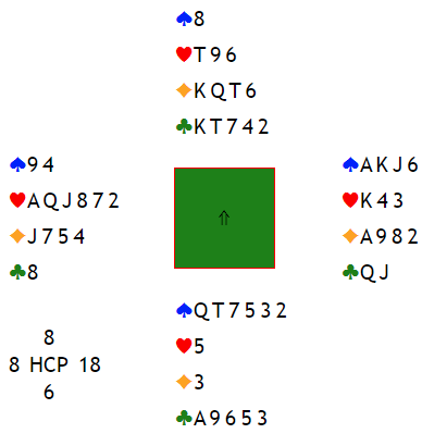 Det er ikke umulig, for syd kan ha lang kløver ved siden av sparen sin. Det er ikke sikkert det er så komfortabelt for syd å melde mer på femtrinnet i sonen med bare damen på topp i spar og fordelingen 6-1-1-5 eller (5-1-1-6) og kanskje kun en kløverhonnør. Og akkurat slik satt det: