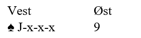 La oss si det ikke sitter kløver Q-J-x tredje, men at vest følger kun to ganger. Da vet du at øst har fem kløver som sammen med tre hjerter og minst tre ruter = minst 11 kort!. Det betyr at øst ikke kan ha fire spar lenger. Hvis det i såfall sitter 4-1 må det være vest som har fire spar. Du spiller spar konge. Om øst følger med nieren kan du trygt spille damen i fargens andre runde uten å stå i fare for å bli lurt av øst med J-9-x-x.