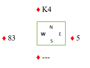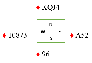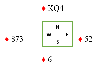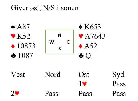 Du spiller kongen og fortsetter med liten til esset. Sitsen oppdages idet vest ikke følger farge andre gang, og du tar den markerte finessen over østs knekt.