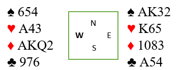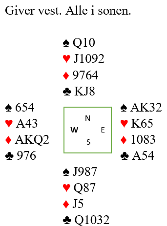 Er trumfen ikke verre enn 3-1 imot er kontrakten sikker men hvordan spille sparfargen? Nord dro selvsagt først trumf til A og K men Vest hadde hj DJ4 så der var det taper. For å sjekke sitsen stjal Nord kløver, dro ruter til kongen og stjal siste kløver også. Og deretter ruter dame og ny til esset som Vest stjal og slo opp igjen kløver til stjeling. Siste ruter ble spilt til bordet og spar derfra. Enig?
