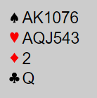 Dette er vanskelig. Du har så gode verdier at det godt kan stå slem, men to små hjerter gjør det litt skummelt. Det kan jo være to hjertertapere fra start. Hvis syd høyner makkerens sperremelding til 4 hjerter er det større sjanse for at makker har singel hjerter, og da er det kanskje en bedre sats å melde slem (6 spar)?
