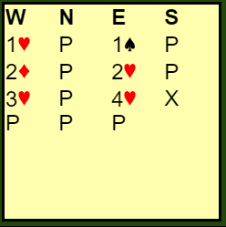 Så etter 1 ruter fra nord meldte øst inn 1 spar flere steder. Syd dobler for å vise hjerter, og vest med sin fin sparstøtte og bra fordeling kan sperremelde, for eksempel med 3 spar. Dette er god bridge, det gjelder å melde når man har god tilpasning!