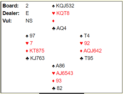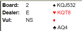 Ved det bordet satt et litt mer ambisiøst par som N/S, ambisiøst med hensyn til system. De hadde nettopp begynt å bruke Multi 2 ruter og hadde nok kun lært de mest vanlige svarene. Så nord meldte 2 hjerter – pass/korriger – for å finne ut hva slags Multi-åpning syd hadde. Og det fant nord raskt ut da det gikk pass rundt og de skulle spille 2 hjerter! Nyttig lærdom vil jeg tro...