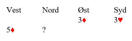 Over svaret 2 ruter melder nord 3 kløver. Du kan si 3 hjerter nå, men det er for de fleste fjerde farge krav (kunstig). Da melder makker 3 spar. Hva nå? 4 hjerter? 5 hjerter...kanskje? 6 ruter...kanskje?
