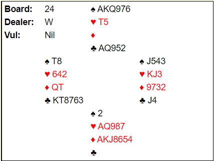 Ved noen bord gikk syd innpå med 1 ruter med litt for tynne kort for innmelding i sonen. Det gikk ikke bra. Vest passet, og øst kom tilbake med en opplysende dobling. Vest passet fornøyd, og 1 ruter doblet ble kontrakten. Det kostet hele 1100, men syd kunne jo etter det blodbadet prøve seg med «men de har jo slem i kortene». Det er ofte en halvdårlig unnskyldning i slike tilfeller, men her er det for så vidt riktig, forutsatt at lagkameratene har et maksresultat. Det hadde de ikke da det var paret som sprengte kortene litt og gikk bet i 7 kløver. Så i den kampen kom det største utslaget i dette spillet,  -1100 og -100, -15 IMP.