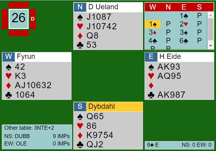 Ved det andre bordet åpnet som du ser lag OLE sin øst (Harald Eide) med 1 kløver og fikk 1 spar fra vest (Kjell Gaute Fyrun). De spiller med såkalte «kløverføringer», så 1 ruter og 1 hjerter i svar viser henholdsvis hjerter og spar. Svaret 1 spar viser enten et 1 grand-svar (1NT direkte er 10-12), eller ruterfarge. Øst reverserte med 2 hjerter. Vest forsøkte å vise hånden sin med 3 ruter, og øst gikk videre med 3 spar. Da var vest sin hånd blitt god i kløverkontrakt, og han sa 4 kløver. Det var nok for Eide som satset på slem.