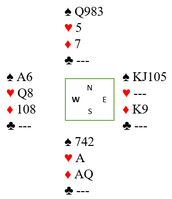 Endelig, la oss si vest legger liten spar idet det spilles spar fra syd i diagramsituasjonen. Åtteren legges fra nord, og øst vinner med tieren. Han kan ikke spille ruter, det gir tre ruterstikk total til spillefører og ni i alt. Så øst må spille spar til vest sitt ess. Vest kan ikke spille ruter heller, og må nå spille hjerter. En lignende skvis-innspillsituasjon oppstår. Nå har forsvaret allerede tatt tre stikk. Idet vest frir seg med hjerter har øst K-J i spar og K-x i ruter. Han må kaste ett kort, og det blir spar knekt og ikke syd skal få to ruterstikk ved å legge ned esset. Syd vinner og spiller inn øst på den nå single spar kongen, og det er forsvarets fjerde stikk. Også da blir det ruter til saks til slutt, ni stikk.