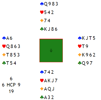 Det er ikke mer enn akkurat for utgang her, men det hjelper litt på at vest spiller ut en liten hjerter til nieren og syds knekt. Hvis kløveren hadde vært maks heldig fordelt ville det nå vært ni stikk. Og det er også tre ruterstikk på en måte, men kun ett inntak hos nord, så det går ikke å få tatt to ruterfinesser.
