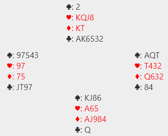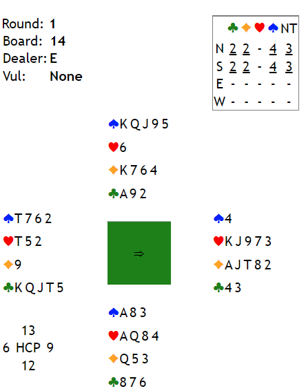 Jeg visste ikke om 6 kløver var best, eller 6NT. Jeg sa 5NT – «pick a slam» så kunne makker foreslå 6 kløver med for eksempel damen dobbel siden han allerede har benektet kløverstøtte med vaslaget 4NT. Han sa imidlertid 6 ruter, sikkert femkorts farge, kanskje seks korts ruter.