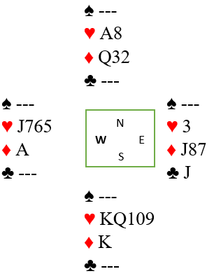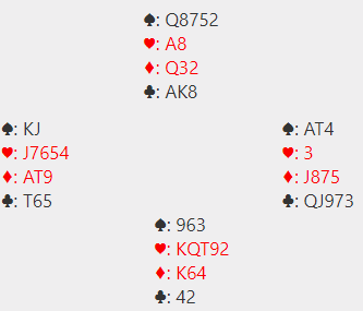Hvis singel ruter konge singel beholdes i sluttposisjonen, og en hjerter forsvinner fra syd i stedet vil det se slik ut med fem kort igjen: