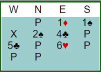 Vest hadde tolket 4 kløver som naturlig og løftet til utgang. Idet øst innså de kanskje var ute og syklet litt sa hun 6 hjerter. Normalt er ikke slik meldesekvenser særlig trygge, men de hadde buklandet i en ganske bra slem i dette tilfellet: