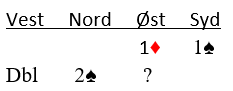 Det er klart at nords melding gjør at øst ikke har så mye melderom til å vise forskjellig styrke. Et prinsipp jeg mener er bra er at etter en lav negativ dobling så bør åpneren melde mest mulig som om det har startet med et en-over-en svar, for eksempel i dette tilfellet som om det har startet med 1 ruter – 1 hjerter. Når det så kommer melding fra nestemann blir det imidlertid litt trangere.