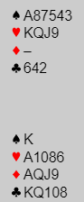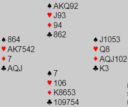 Dette var kveldens første spill. Som du greit kan se har N/S en glimrende lilleslem i hjerter med disse kortene. Selv om hjerter satt 4-1 var det ganske greit å vinne tolv stikk siden sparfargen kunne godspilles med kun en stjeling (satt 3-3). Å score +980 for 6 hjerter med tolv stikk ga imidlertid hele 90%, kun slått av en altfor ambisiøs stamp i 5 ruter av ett Ø/V-par. Det kostet -1100.