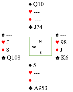 Utspillet stjeles altså, og hjerter dame har blitt ett stikk. Så ruter konge til østs ess. Han fortsetter best med ruter eller hjerter. La oss si han spiller ruter til nords honnør. Underveis tas trumfen ut, og en ruter trumfes hos syd, hjerter dame innkasseres med kløveravkast, og syds siste hjerter stjeles hos nord. Eliminasjonen er fullført, og det blir seende slik ut: