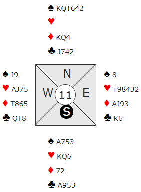 3NT er håpløst om motspillet finnes. Nord kan spille ut hjerter, spesielt hvis syd har doblet og dermed bedt om hjerterutspill (bordets først meldte/viste farge). Syd vinner første runde hjerter og spiller spar til nords konge. Så mer hjerter til syd og mer spar, denne gangen gjennom vests Q-x mot renons. Forsvaret får i så fall syv sparstikk og tre hjerterstikk, seks bet!