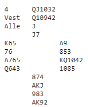 Nord er i 4 spar, og han har vist hjerter ved siden av sparfargen sin. Med åpne kort er det ikke så vanskelig å se at Ø/V i tillegg til to trumfstikk og ett ruterstikk kan få en stjeling hos vest om de spiller hjerter tidlig nok. De har jo to inntak i trumf.