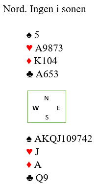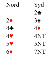 Over 3 spar er det kontrollmeldinger før vest på 4NT viser to ess, og på 5NT - storeslemsinvitt - viser vest ruter konge (melder av spesifikk konge). Om nord hadde hatt kløver eller hjerter konge i stedet ville syd kommet til samme konklusjon, han kan telle tretten stikk! Og det er ingen grunn til å spille sparkontrakt når spillefører VET det er tretten stikk i grand.