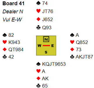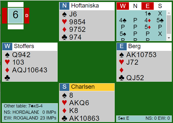 Ved det andre bordet doblet syd østs 1 kløver og sa 4 spar neste gang, ganske normalt meldt selv om han kanskje kunne doblet først, så krevd med moptartens farge en gang før han neste gang sa 4 spar for å vise skikkelige monsterkort. Ved det bordet ble syd spilllende 4 spar og noterte +420 som normalt er et uavgjort spill. Men denne gangen var det 9 IMP ut.