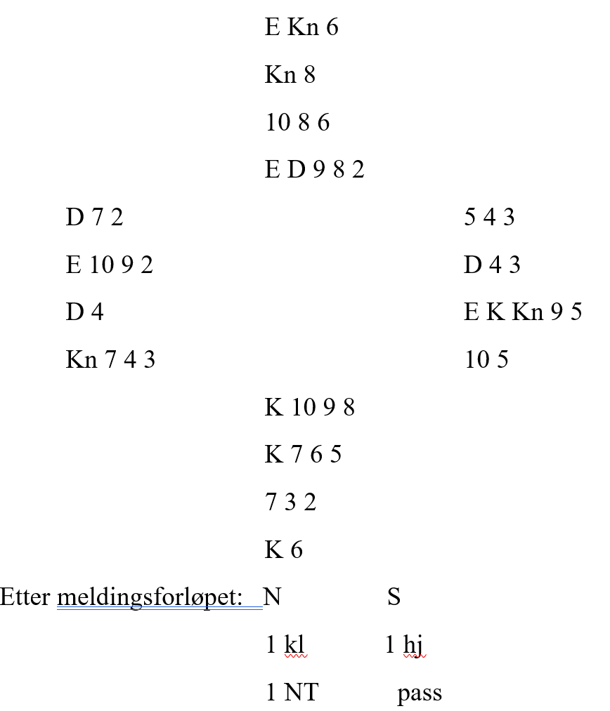 AJ6 mot K1098, og det var mulig å fiske begge veier. På grunn av lite inntak virket det som at det var best å legge ned spar esset og så spille knekten og ta finessen. Det fungerte fint, og knekten sto, og Sofie var glad og fornøyd og tok spar finessen en gang til og tenkte at her er det mulig å kaste en hjertertaper, og 3kl vil da stå. Så enkelt var det ikke, Wenche satt jo med spar dame bak kongen og hadde i tempo, helt uten tenkepause, lagt en liten første runde, så Sofie fikk aldri stikk på spar kongen sin da hun ikke lengre hadde inntak til kongen. Godt gjort av Wenche!