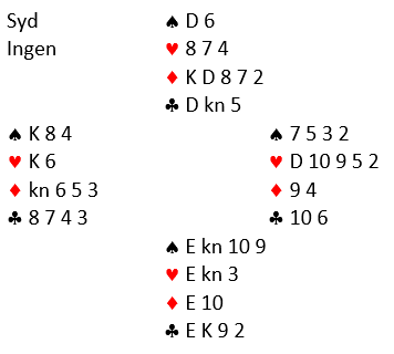 Så kom kløver konge i diagramsituasjonen. Vest som hadde ruterlengden hadde kun en hjerterhonnør og var ikke skviset. Toppspilleren Jansma så selvsagt at han måtte blanke hjerter konge for å holde ruteren idet det siste kløverstikket ble tatt fra syd. Siden ruterfargen ikke gikk ble det ett stikk for lite og en bet.
