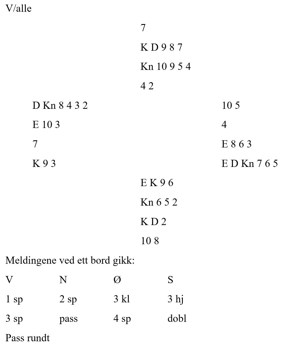 Dermed ble det en knallhard utgang som skulle spilles av Ann-Mari (nord). Øst spilte ut ruter knekt.