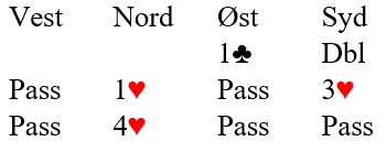Det er klart syd føler hun har gode kort, men 2 hjerter viser også gode kort her. Med vanlig åpningsstyrke bør dobleren passe på 1 hjerter i denne situasjonen. Så hånden er vel sånn ca. til 2,5 hjerter, og siden syd valgte 3 hjerter som bør vise tett oppunder 20 poeng må nord legge på til utgang.