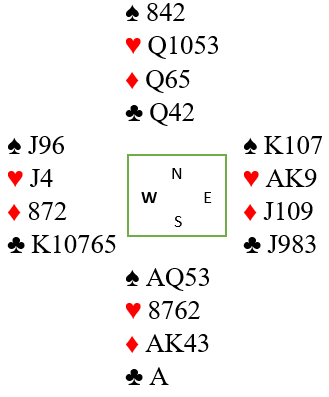 Her har spillefører informasjon, østs åpning. Uten A-K i hjerter hos øst blir det knapt en åpnngshånd, så Ann-Mari spilte på J-9-x i hjerter hos vest (eller J-9 dobbel hvis nieren kommer på). Hun stakk den utspilte ruteren med esset og spilte liten hjerter til fireeren og femmeren! Men øst hadde nieren som hun stakk med før hun fortsatte med ruter. Den ble stukket med damen, så spar til damen og nok en hjerter mot nord til knekt, dame og honnør. Øst tok det tredje hjerterstikket sitt og spilte kløver, men kløverskiftet kom litt for sent til å skape trøbbel. Kløver ess vant stikket, så to store ruter med sparavkast fulgt av spar til stjeling. Siden den fargen satt 3-3 var det med tre sparstikk i alt ti stikk. Dermed ble det en "fet" +620 til notering etter på en måte å ha gjort blindemann (syd) til hovedhånd.