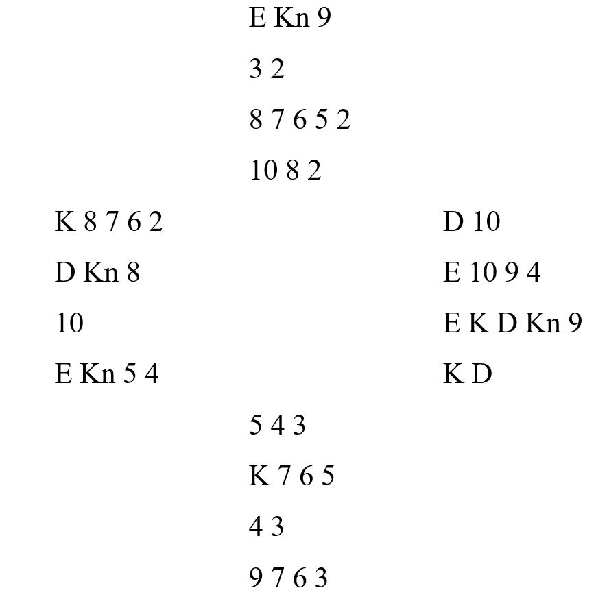 Slik det satt ville enhver spilleplan ført frem. Men bytt kløver knekt over til øst og et annet lite kort derfra tilbake til vest. Da vil øst bli skviset i sluttposisjonen. Men da går jo hjerterfinessen, sier du? Ja, det er riktig, men med denne spilleplanen vinnes det også om det er vest som har hjerter konge sammen med kløver knekt minst fjerde.