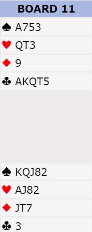 Claimeren som ble avhengig av kløver knekt tredje (!) fikk altså også tolv stikk. Og når regnskapet skal gjøres opp er +980 verd akkurat det samme om du har spilt på en 15-20% sjanse som om du har spilt perfekt å fått med alt, la oss si 80% vinnersjanse.