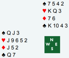Etter pass fra nord og 1 ruter fra øst svarte vest 1 hjerter. Øst hoppet til 3NT. Det betyr selvsagt for de fleste en sterk hånd. Men med for eksempel 18-19 balanserte sies 2NT. Så det er en vanlig definisjon at 3NT gjenmelding innebærer en meget sterk hånd med en god, lang farge (her ruter).