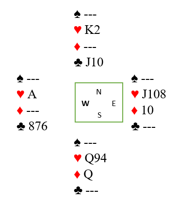 Det er kanskje andre spilleplaner som kan ha noe for seg her, og kanskje er bedre også. Flere ting kan muligens føre frem hvis ikke motspillet er perfekt. Jeg kan for eksemel se for meg at å få stjålet enda en ruter hos vest, med trumfesset, ville vært bra hvis sluttposisjonen blir riktig. Da ville det ved å spille et kort fra vest med J-10-8 i hjerter gjenværende i trumf vært helt sikkert at det ble et tidende stikk for den kombinasjonen. Men akkurat timingen for å få til noe sånt er litt uklar.